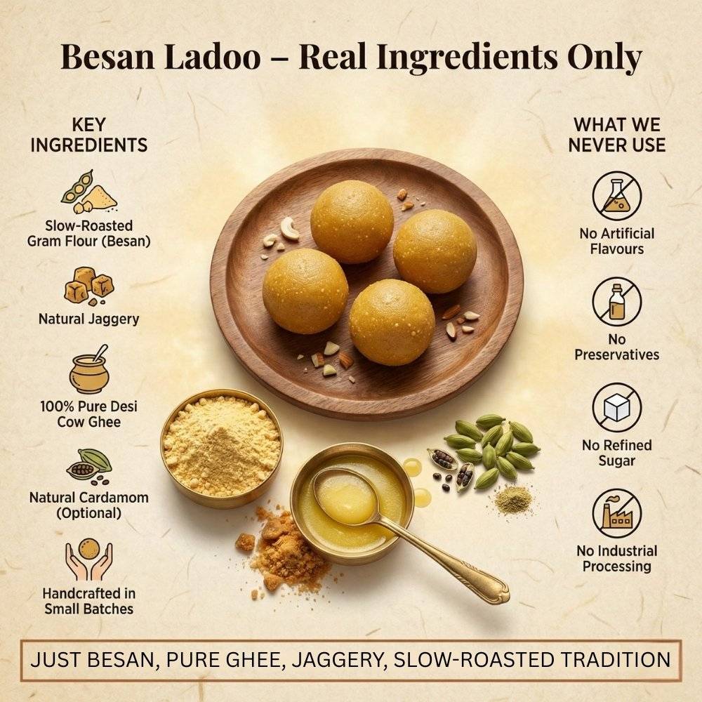 Prepared in small batches using traditional techniques, our Besan Ladoo offers deep roasted notes, natural sweetness, and satisfying richness — without refined sugar, preservatives, or artificial additives.