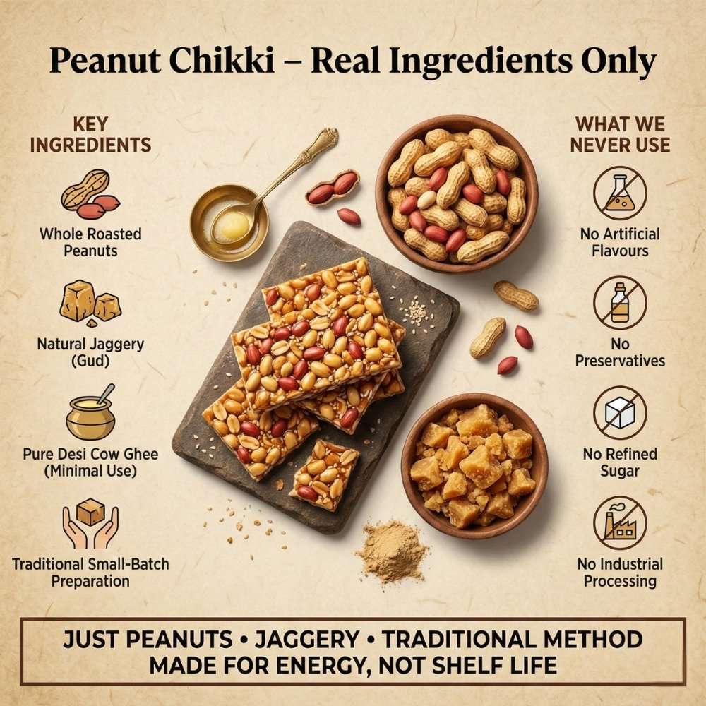 Every slab of chikki is poured, spread, and cut with attention to detail that machines can’t replicate. Our philosophy rests on three unwavering principles: Trust (through ingredient transparency), Purity (by saying no to shortcuts and chemicals), and a Deep Focus on Health (ensuring every bite offers genuine nourishment). When you choose our chikki, you’re choosing food made the way it was meant to be—with care, intention, and respect for your well-being.