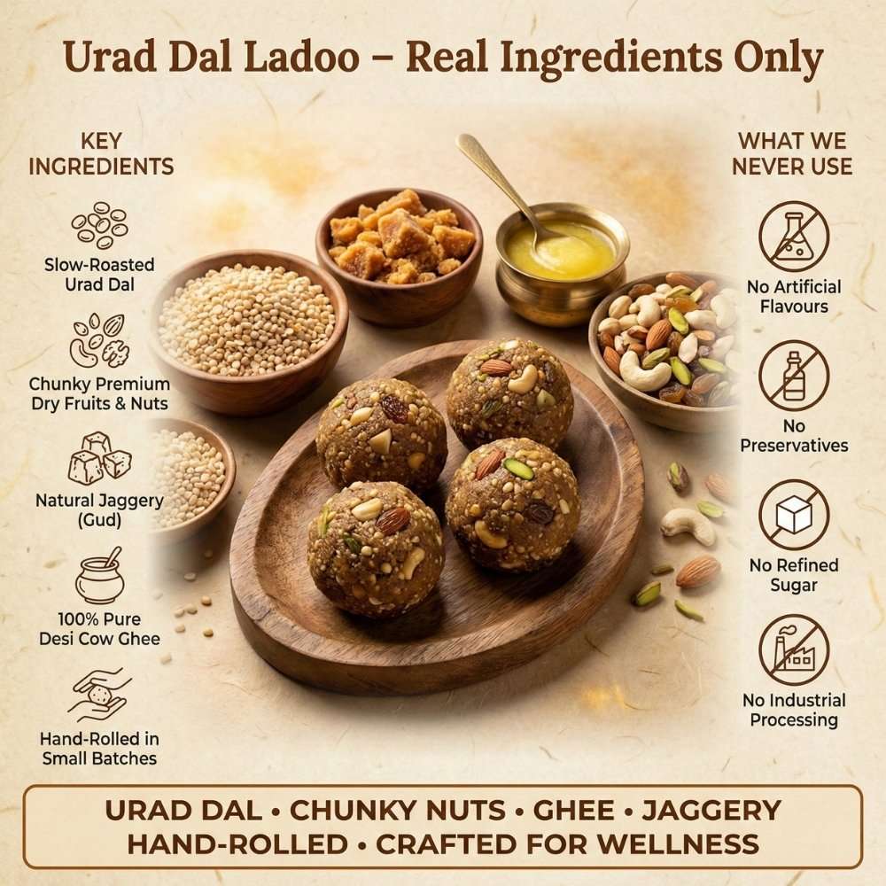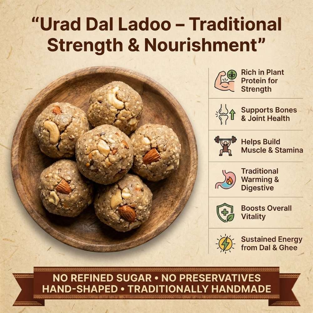 Urad dal is considered heavy in Ayurveda. However, our traditional preparation is key: we slow-roast the dal thoroughly and include digestive spices like ginger and cardamom, which significantly improves its digestibility. We recommend consuming it in moderation (one laddu at a time) and not at night.